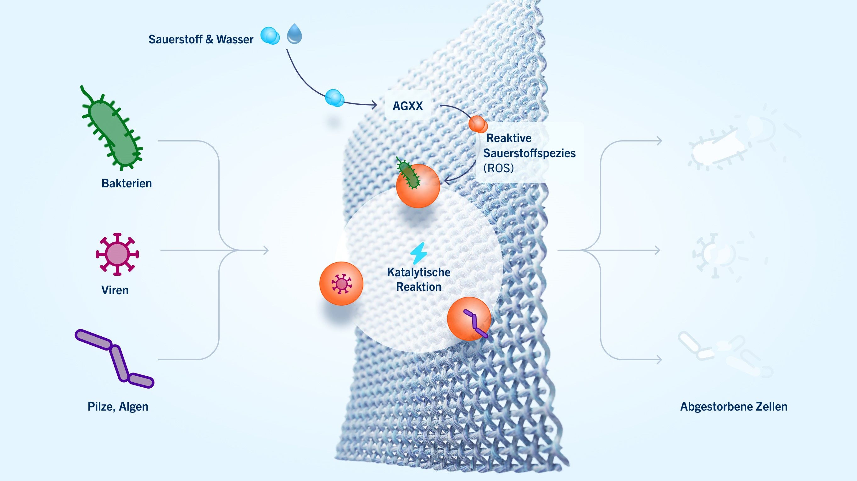 Möglich macht dies der neuartige Wirkmechanismus. AGXX ist eine hocheffiziente katalytische Technologie, die die Wechselwirkung zweier Edelmetalle nutzt und auf Redoxreaktionen und mikroelektrischen Feldeffekten basiert. Dabei wird der in der Luft enthaltene Sauerstoff in Verbindung mit Wasser aus der Luftfeuchtigkeit in Sauerstoffradikale (ROS: reactive oxygen species, dt.: reaktive Sauerstoffspezies) umgewandelt. Diese reagieren wiederum mit den Mikroorganismen und töten sie zuverlässig ab. Gleichzeitig wird die Bildung von Biofilmen verhindert.