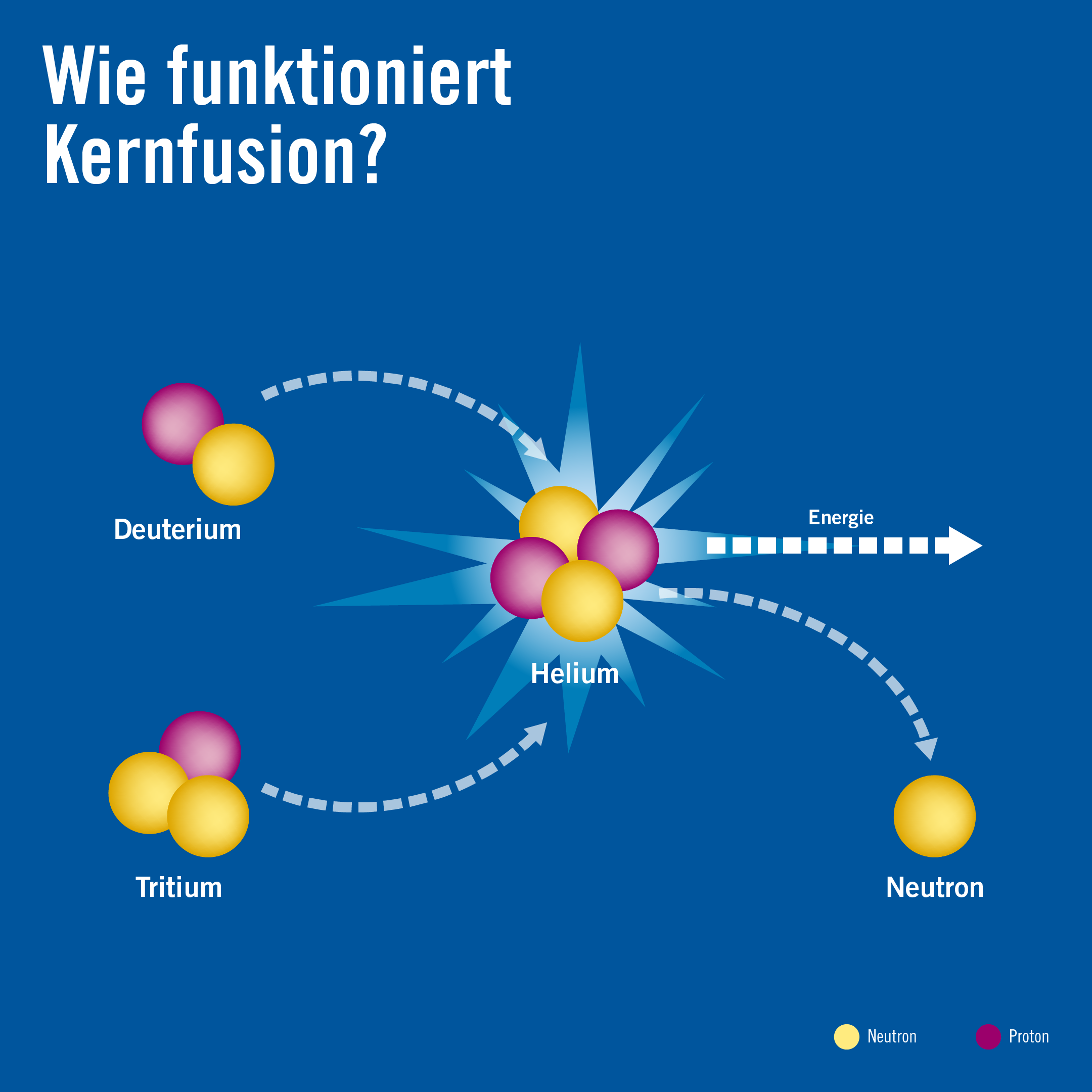 Ausgangsmaterial für die Kernfusion sind die Wasserstoffisotope Deuterium und Tritium. Sie können aus einfachem Wasser bspw. aus Meerwasser oder Abwässern gewonnen werden. Die energiereichen Neutronen aus dem Fusionsprozess erzeugen Wasserdampf, der eine Turbine antreibt und die wiederum einen Generator, der Strom erzeugt.