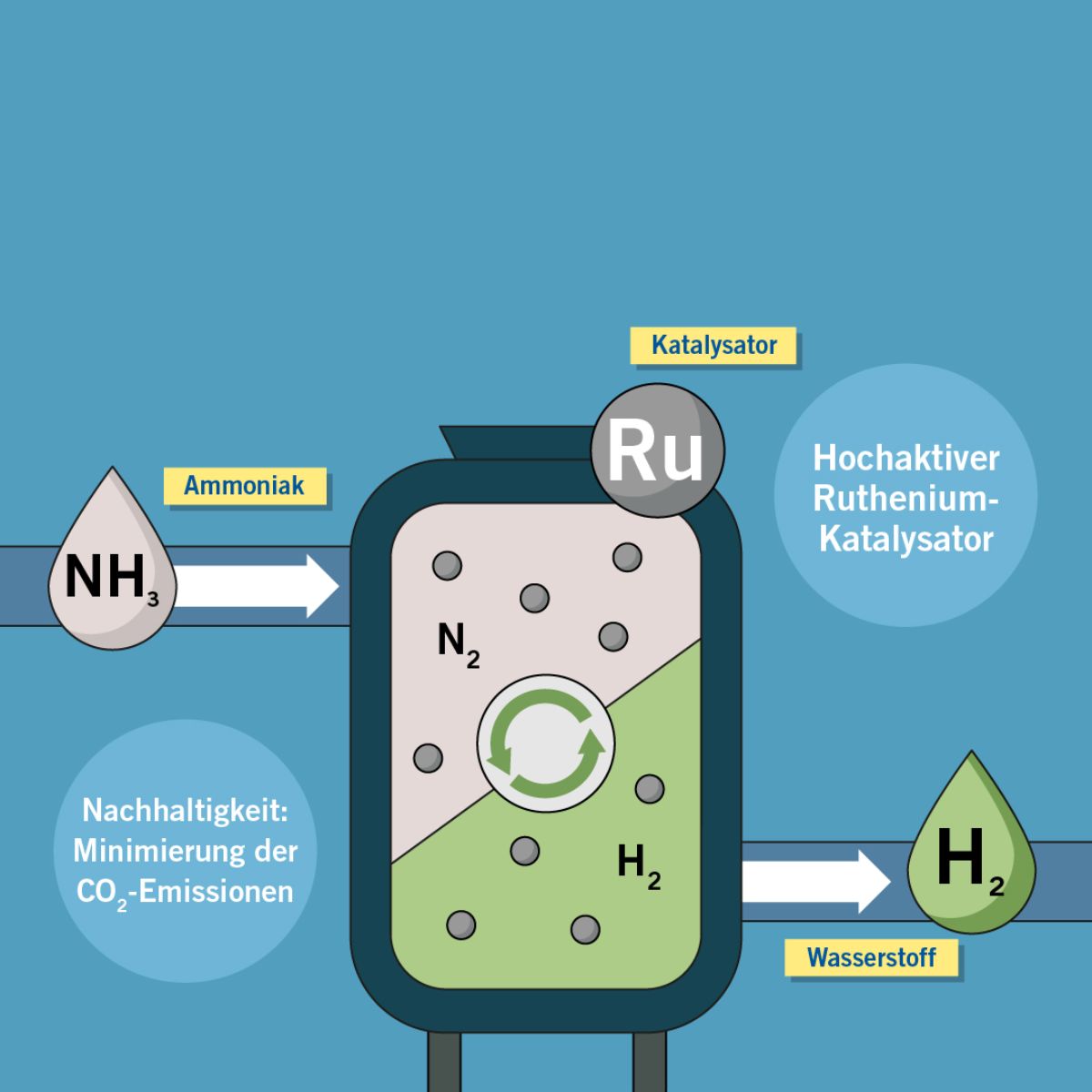 So „verpackt“ in Ammoniak lässt sich die Transporthürde von Wasserstoff nehmen. Voraussetzung für das Einbringen und Auslösen von Wasserstoff aus diesem Trägergas ist eine entsprechende Technologie. Heraeus bietet dazu einsatzbereite Katalysatorkonzepte mit Ruthenium an. Die Entwicklung zielt dabei auf eine effiziente Nutzung des Edelmetalls zur möglichst vollständigen Umwandlung und Wiedergewinnung von Wasserstoff bei diesem Transportkonzept.