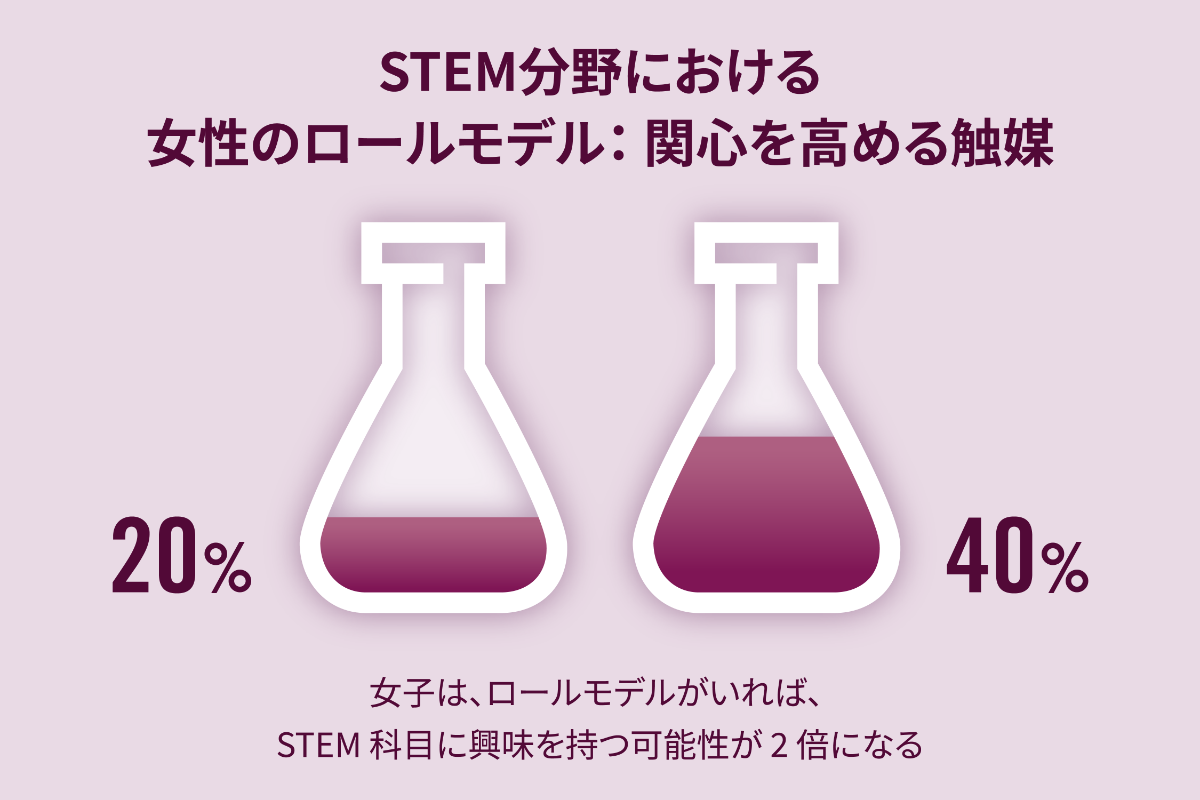 米国のソフトウェア会社マイクロソフトの調査によると、調査対象となった若い女性のおよそ5分の2が、科学、技術、工学、数学の頭文字をとったSTEM科目に関心があり、その分野でロールモデルとなる人物がいれば、ロールモデルとなる人物がいない調査対象のほぼ2倍であることがわかった。さらに、これらの分野でロールモデルを持つ女子学生は、ロールモデルを持たない学生よりも、STEM科目の総合的な成績を高く評価しています。女性のロールモデルは、若い女性の将来のキャリア選択にとって極めて重要であり、彼女たちの自信を高めることができるのです。