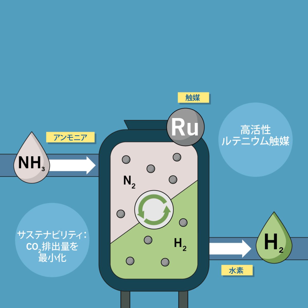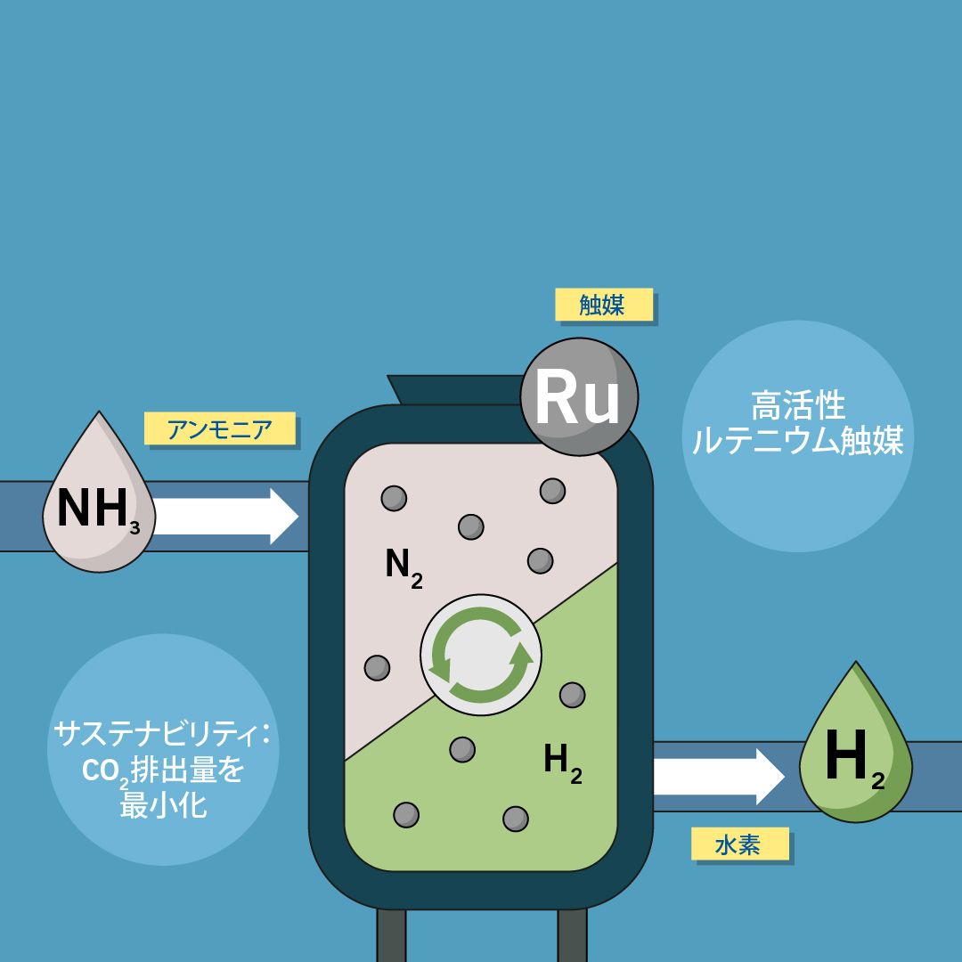 そのため、アンモニアで「パッケージする」ことにより、水素輸送のハードルを克服できます。そしてキャリアガスとしてのアンモニアへの水素の添加や抽出の前提条件は、適切な技術です。ヘレウスは、ルテニウムを用いたすぐに使える触媒のコンセプトを提案しています。この輸送コンセプトにおける最も効率の良い水素の変換と回収を見据えて、貴金属の効率的な利用を目指した開発を行っています。